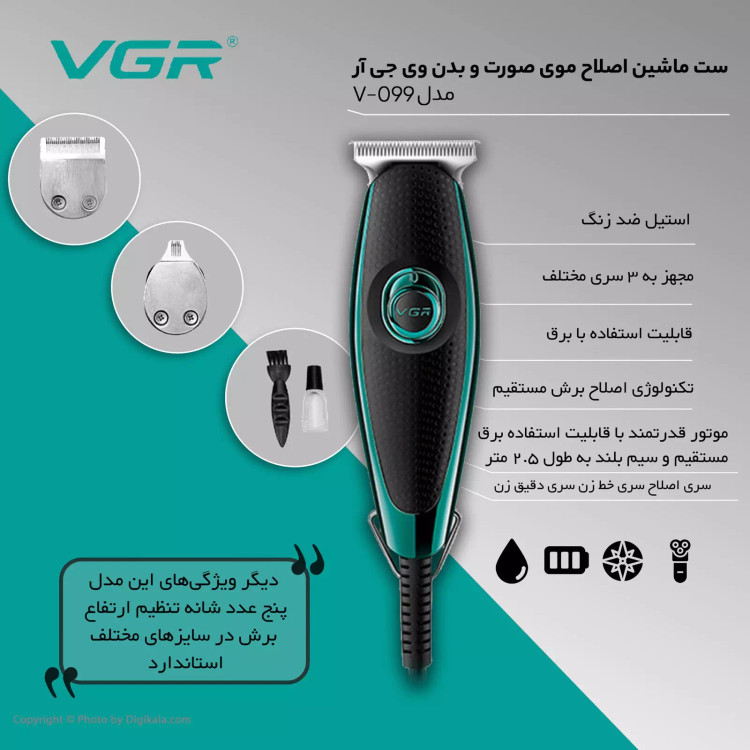 ماشین اصلاح وی جی آر مدل VGR V- یکی از محصولات با کیفیت کمپانی وی جی آر/VGR است که از کیفیت بالایی برخوردار است و دارای ظاهری زیبا بوده که توجه کاربران زیادی را به خود جلب کرده است، این دستگاه از برق مستقیم شهری تغذیه می کند و دارای . متر سیم می ب...