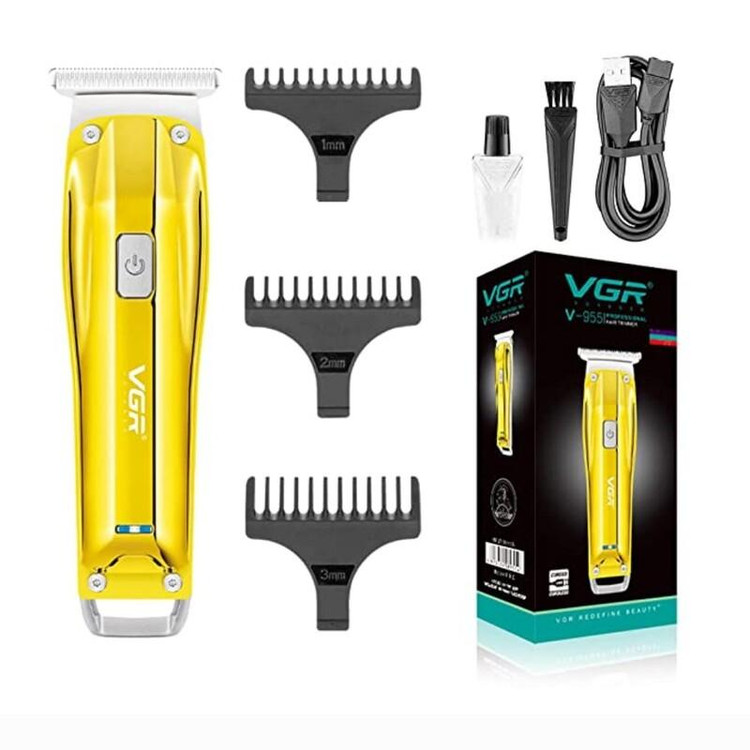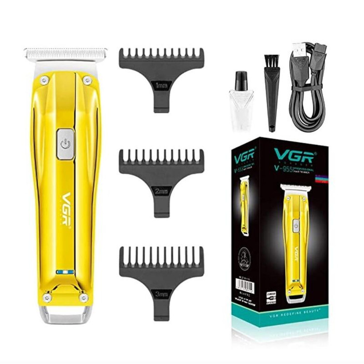 درون جعبه این محصول سه سری در اندازههای 1، 2 و 4 میلیمتری، یک روغن مخصوص ماشین اصلاح، یک برس برای تمیزکردن تیغهها، کابل مربوط به شارژ دستگاه و همچنین یک محافظ برای تیغه در نظر گرفته شده است. این محافظ تیغه میتواند از آسیب رسیدن احتمالی به تیغه در هنگام نگهداری و یا جابهجایی دستگاه حفاظت کند. نشانگر LED موجود روی زن VGR مدل V-955، در مواقعی که باتری دستگاه ضعیف است و یا دستگاه در حالت شارژ است، به رنگ قرمز در میآید. آبی شدن این اندیکاتور نیز به معنای شارژ شدن کامل دستگاه است
