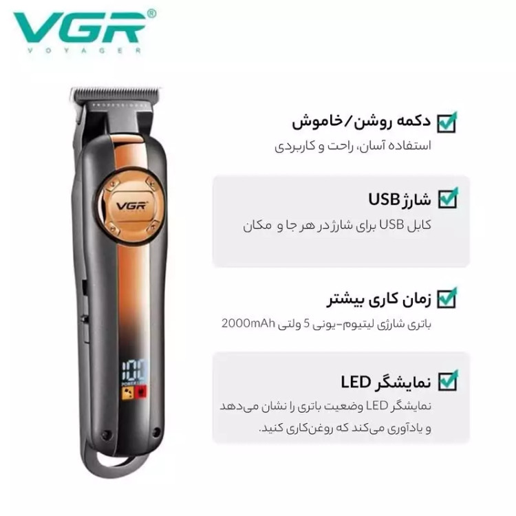 اقلام همراه خط زن وی جی آر V941 :کابل USB، 3 عدد شانه در سایز های 1.5/3/6 میلی متر، برس،روغن