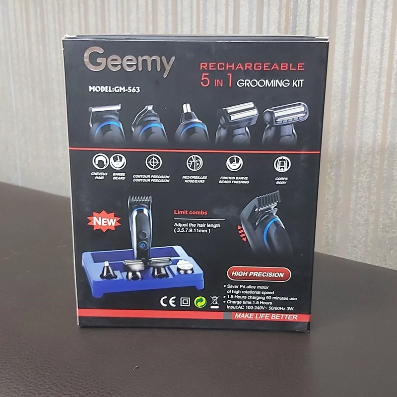 ست ماشین اصلاح Geemy GM-563 با قابلیت کار با باتری قابل شارژ و شارژ مجدد از شبکه 220 ولت، آن را برای سفرها و سفرهای کاری ضروری می سازد. شارژ کامل باتری آن 90 دقیقه زمان می برد. پس از آن می توان به مدت 90 دقیقه به اصلاح پرداخت.