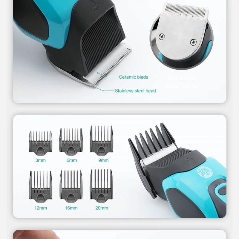 شانه راهنما، برس تمیز کردن، شانه حیوانات خانگی، کابل شارژ USB، دفترچه راهنمای کاربر جنس تیغه فولاد ضد زنگ ارتقا یافته این ماشین اصلاح حیوانات برای محافظت از حیوان خانگی مورد علاقه شما در برابر آسیب بسیار ایمن است.