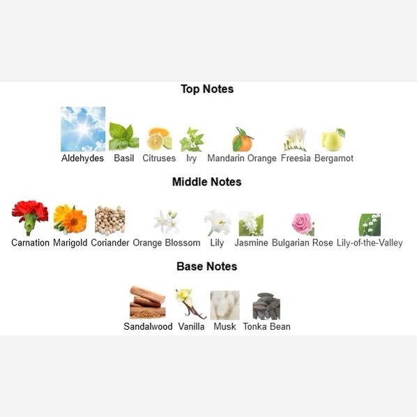 نت های اولیه آلدهید، ریحان، مرکبات، پیچک، پرتقال ماندارین، فریزیا و ترنج هستند. رایحه میانی گل میخک، گل همیشه بهار، گشنیز، شکوفه پرتقال، زنبق، یاس، رز بلغاری و زنبق دره است. نت های پایه چوب صندل، وانیل، مشک و دانه تونکا هستند.
