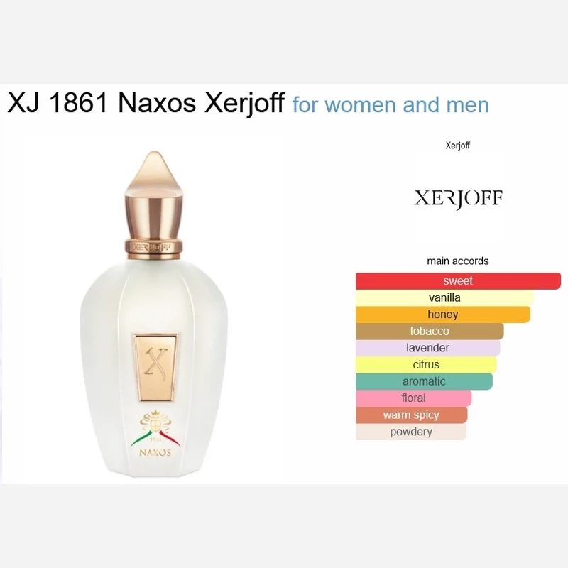 XJ 1861 Naxos by Xerjoff عطری است با رایحه مرکباتی زنانه و مردانه که در سال 2015 به بازار عرضه شد. نت های ابتدایی اسطوخودوس، ترنج و لیمو هستند. نت های میانی عسل، دارچین، ترمه و یاس سامباک هستند. رایحه پایه برگ تنباکو، وانیل و دانه تونکا است.