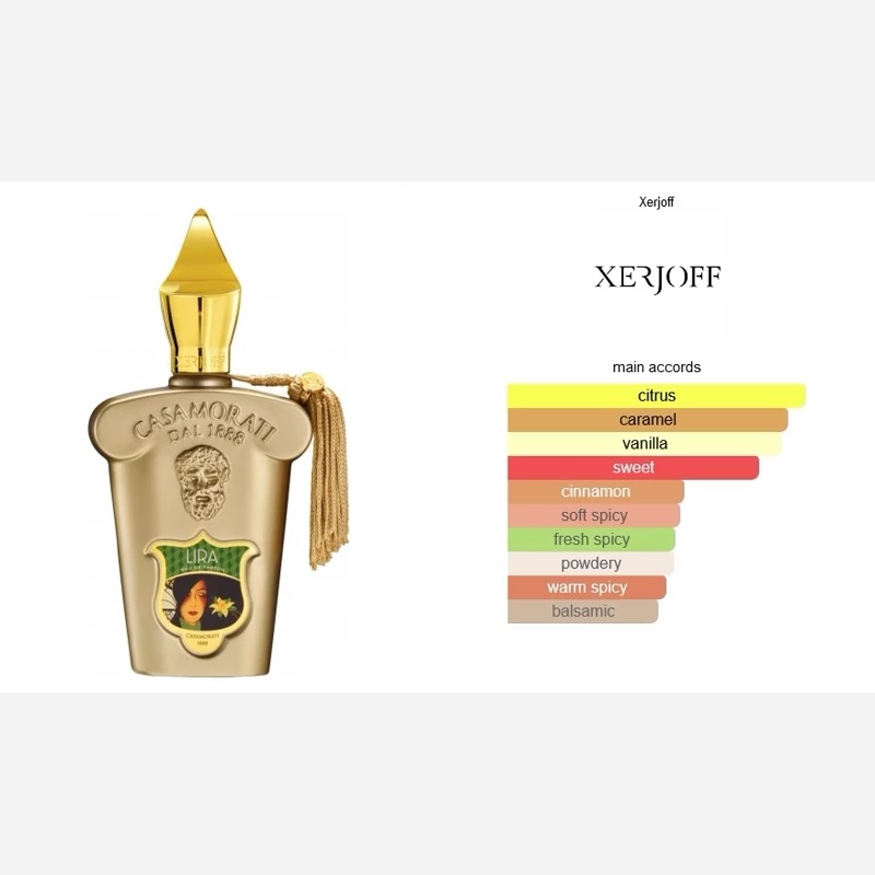 Lira by Xerjoff عطری است از گل کهربا و زنانه که در سال 2011 وارد بازار شد. سازنده این عطر کریس موریس است. رایحه اولیه: پرتقال خونی ، ترنج و اسطوخودوس ؛ رایحه میانی دارچین ، شیرین بیان و یاسمن است. رایحه اولیه شامل کارامل ، وانیل و مشک است.